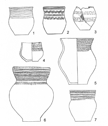 Geschweifte Becher sind am Hals mit Schnur- oder Stich- und Ritzeindrücken verziert. Unverzierte Becher kommen auch vor, was ihre Zuordnung erschwert. Im Gebiet der -> Oderschnurkeramik, also hauptsächlich in der Uckermark und dem Pyritzer Weizacker beiderseits der unteren Oder, ist eine Trennung von der Oderschnurkeramik schwierig (Schroeder 1951; Wittkopp 2019). Neben horizontal angeordneten linearen Mustern kommen auch Wellenlinien und verbreitet Fischgrät- oder Tannenzweigmuster vor (Kramer 1961; Geisler 1966; Boroffka 1998; Dirks/Stark 2016) (Abb. 1, 2). Selten sind Schalen und Amphoren, ferner kommen sogenannte Riesenbecher vor, die meist unverziert sind, aber unter dem Rand ein bis drei Wulstleisten tragen können (Wetzel 1969; Lehmphul 2018) (Abb. 3).