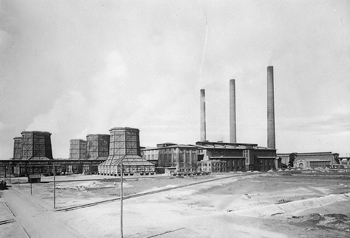 Der Aufbau der Aluminiumhütte samt zugehöriger Tonerdefabrik und dem Kraftwerk erfolgte unter immensen Anstrengungen, auch unter Einsatz von Kriegsgefangenen. 1918 waren etwa 13.000 Arbeiter auf der Baustelle tätig. Die notwendige Braunkohle lieferte die „Ilse-Bergbau AG“ aus der „Grube Erika“, für deren Transport eine eigene Kohlebahn eingerichtet wurde (Abb. 2, 3). Am 15. Oktober 1918 wurde das Kraftwerk angefahren und nahm damit nach nur 18 Monaten Bauzeit seinen Betrieb auf. Bereits zwei Tage darauf erfolgte die Schmelze des ersten Aluminiums. In dieser Ausbaustufe produzierten drei 16 MW und eine 18 MW-Turbine Strom (Kahl 2009, 103f.) (Abb. 4-6).